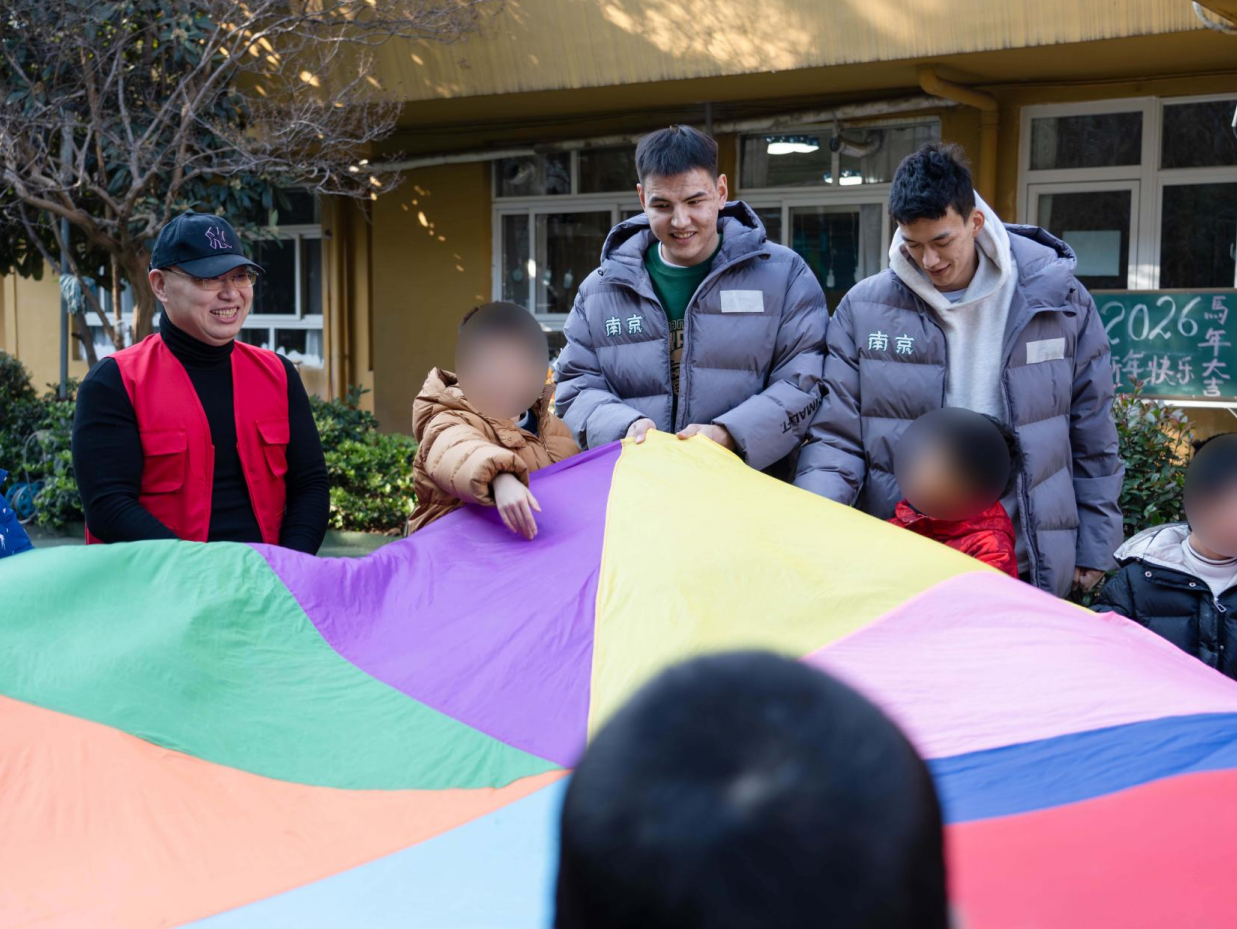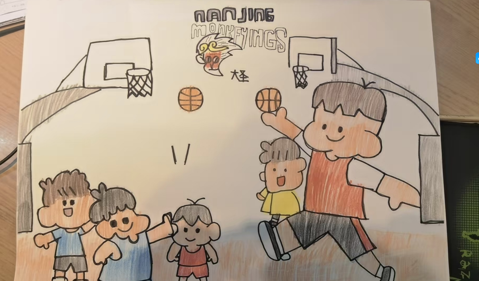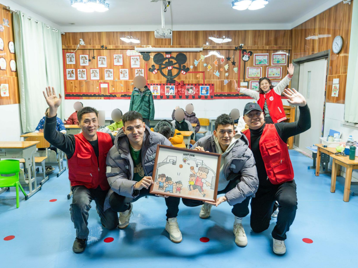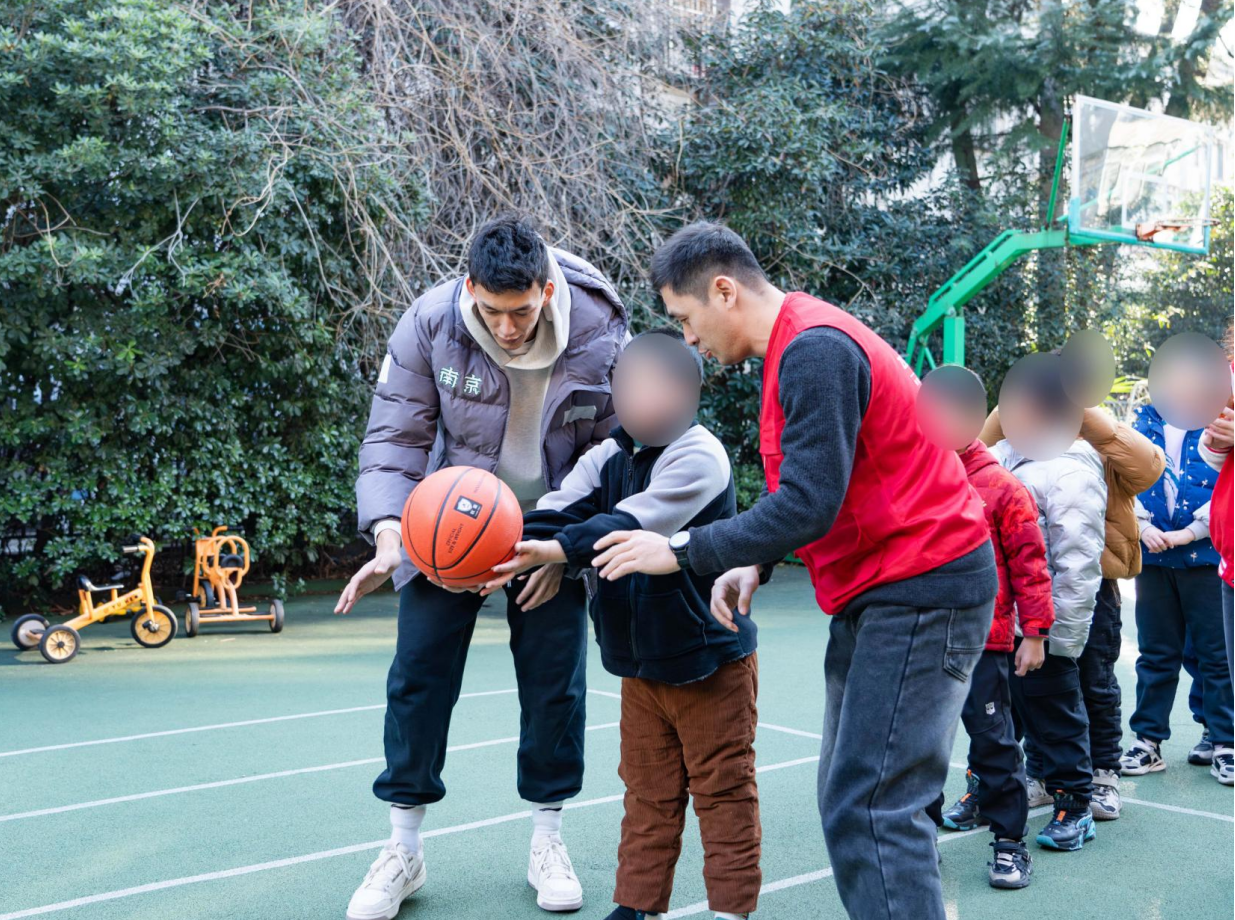 在陪伴活动中,同曦球员阿卜杜赛麦提·胡布朗带领孩子们进行基础篮球动作教学,在运动中传递快乐与勇气。随后,他与“南京胖哥”、志愿者魏鑫一同参与集体绘画创作,用色彩搭建沟通的桥梁。活动特别设置了健康环节:孩子们在球员的辅助下,使用宙光品牌抑菌洗手液完成洗手,并由球员亲自使用宙光品牌JJ型卫生湿巾擦拭玩具区桌面,以互动方式普及抗菌防护知识,让健康习惯融入生活细节。