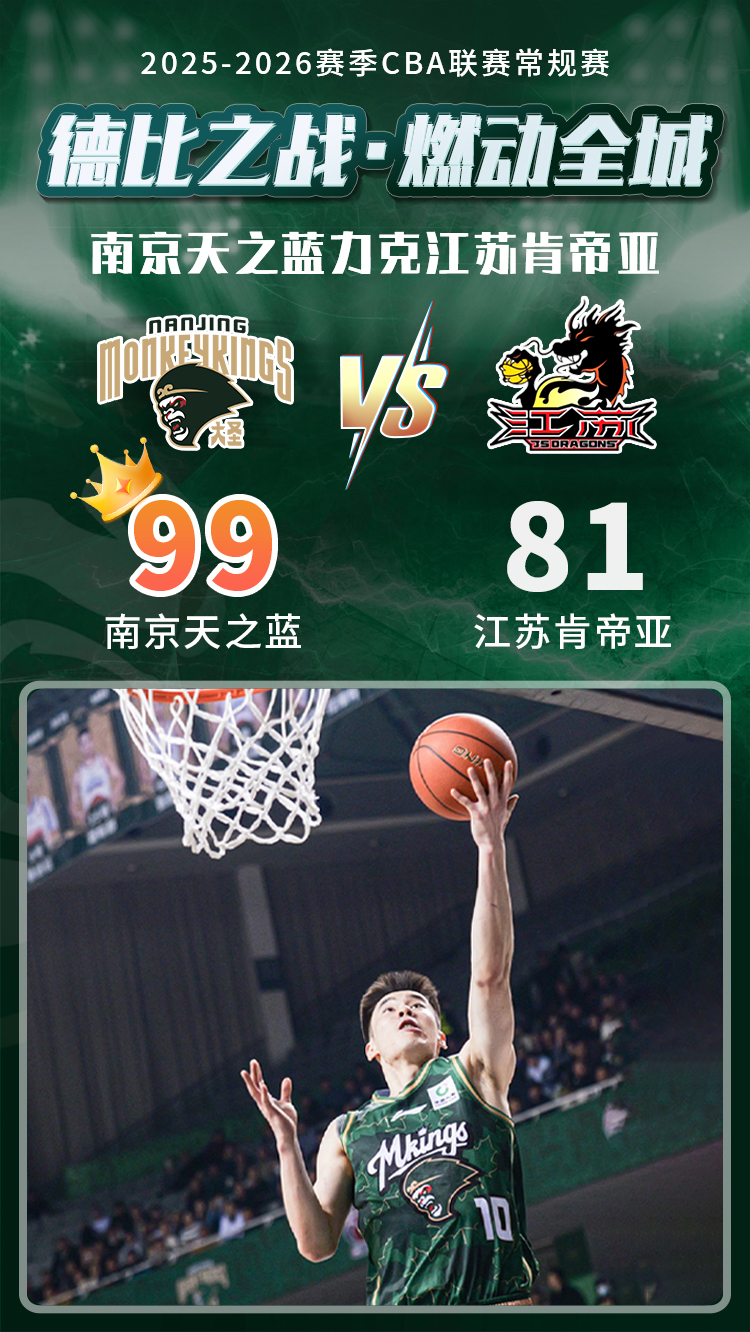 2025年12月28日,2025-2026赛季CBA联赛常规赛第7轮,南京天之蓝队坐镇主场迎战江苏肯帝亚。对于这场备受关注的德比之战,南京天之蓝队奋勇出击,在主力球员因上场比赛不同程度受伤的情况下,拼出青春风采、打出篮球魅力,以一场主场胜利(南京天之蓝99-81江苏肯帝亚)迎接充满希望的2026年。