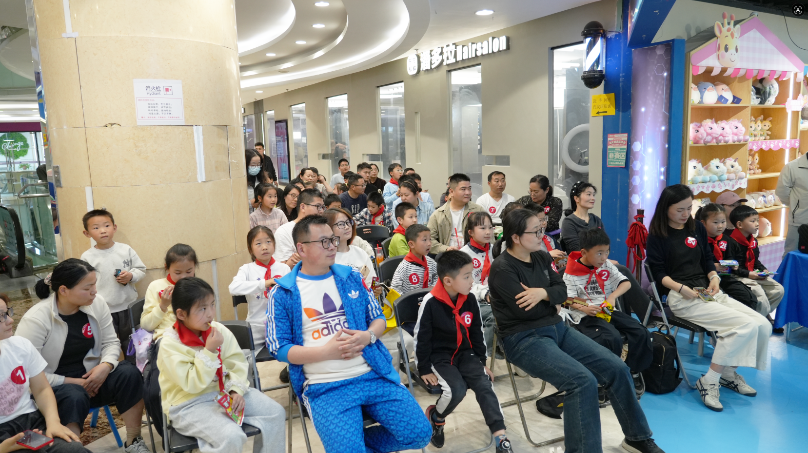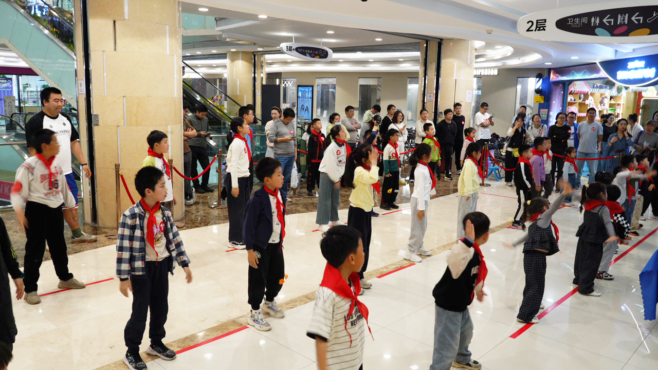 下午14:00,伴随着80、90年代经典儿歌,家长们牵着孩子的手陆续签到。每位小朋友和家长都郑重地系上红领巾,在复古背景板前留下了一张张“穿越照”。