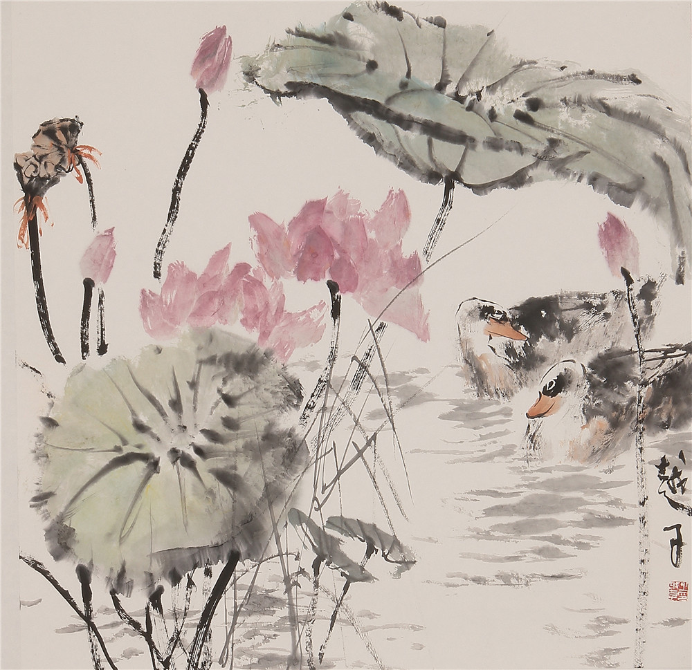 荷花双凫 69×69cm